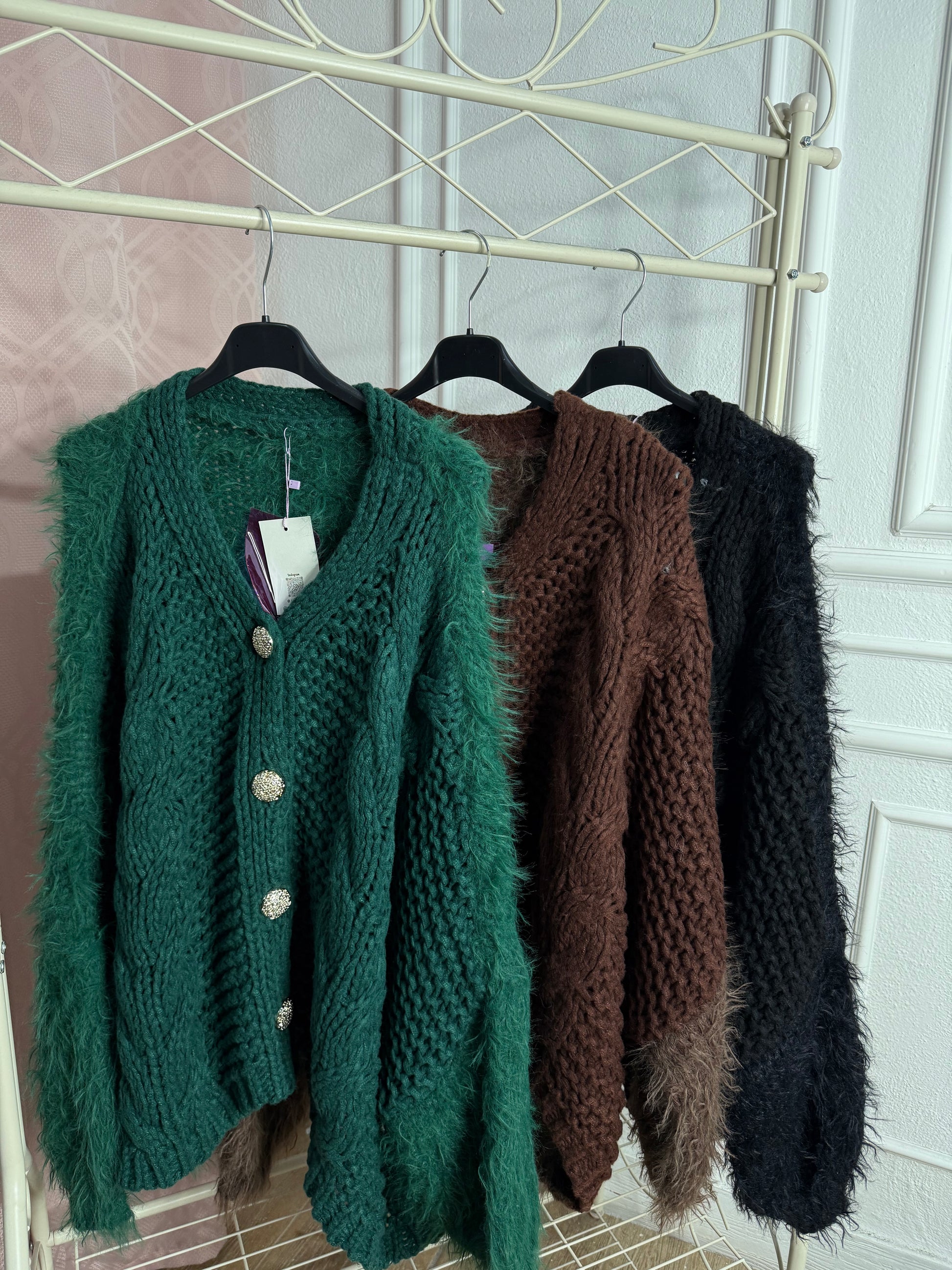 "Aggiungi un tocco di classe al tuo look con il nostro cardigan over-size con comodi bottoni dorati. Perfetto per ogni occasione, questo cardigan ti farà sentire elegante e alla moda. Scegli la comodità e la raffinatezza, scegli il nostro cardigan Bottoni oro."