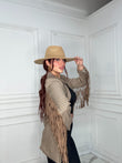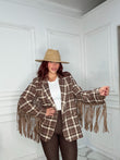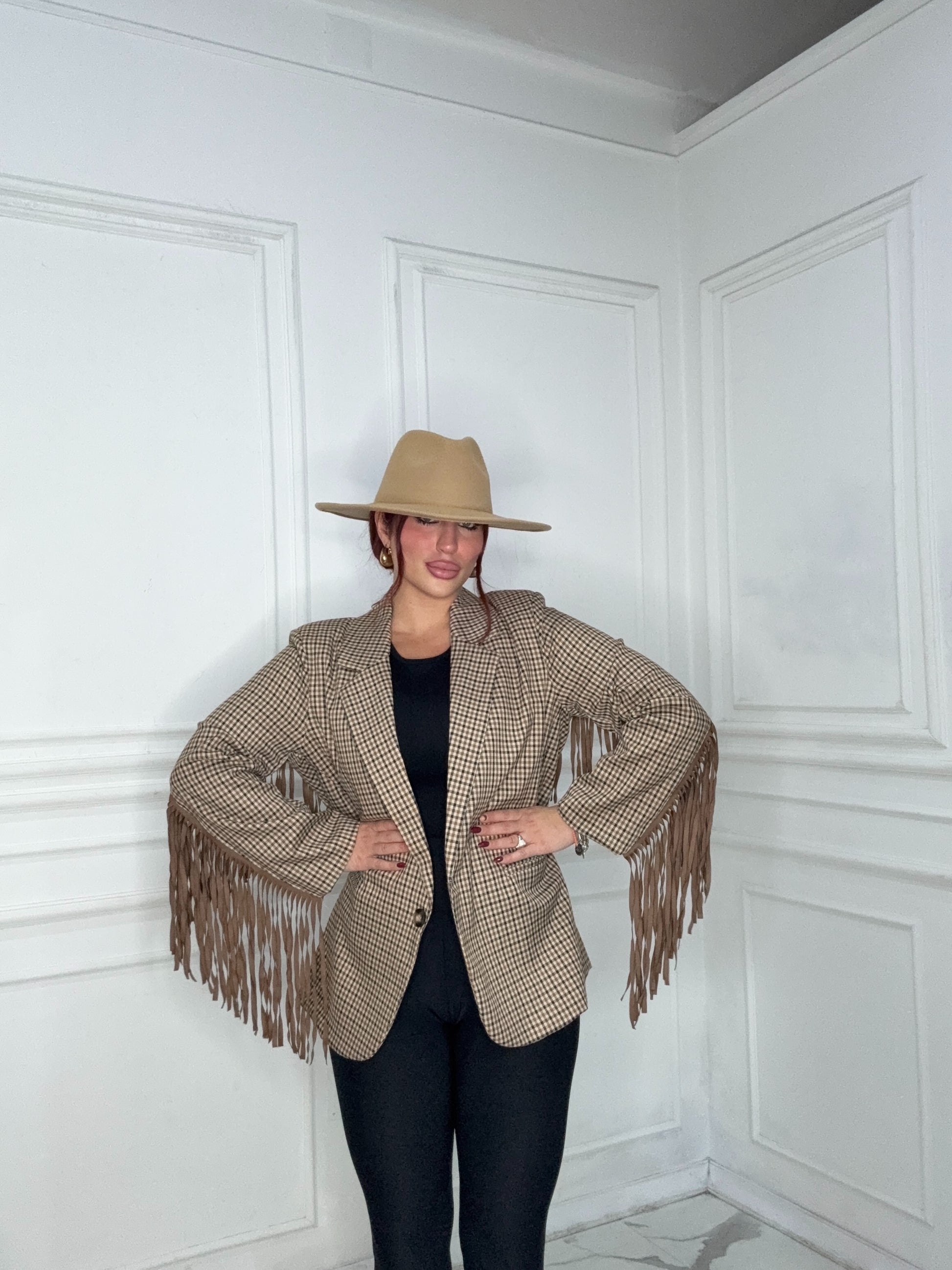 "Copri il tuo stile con la Giacca Quadri Frange! Realizzata con materiali di alta qualità, sarà il perfetto complemento ai tuoi outfit. Le frange sul retro aggiungono un tocco di originalità e divertimento. Non passare inosservato con questa giacca unica!"